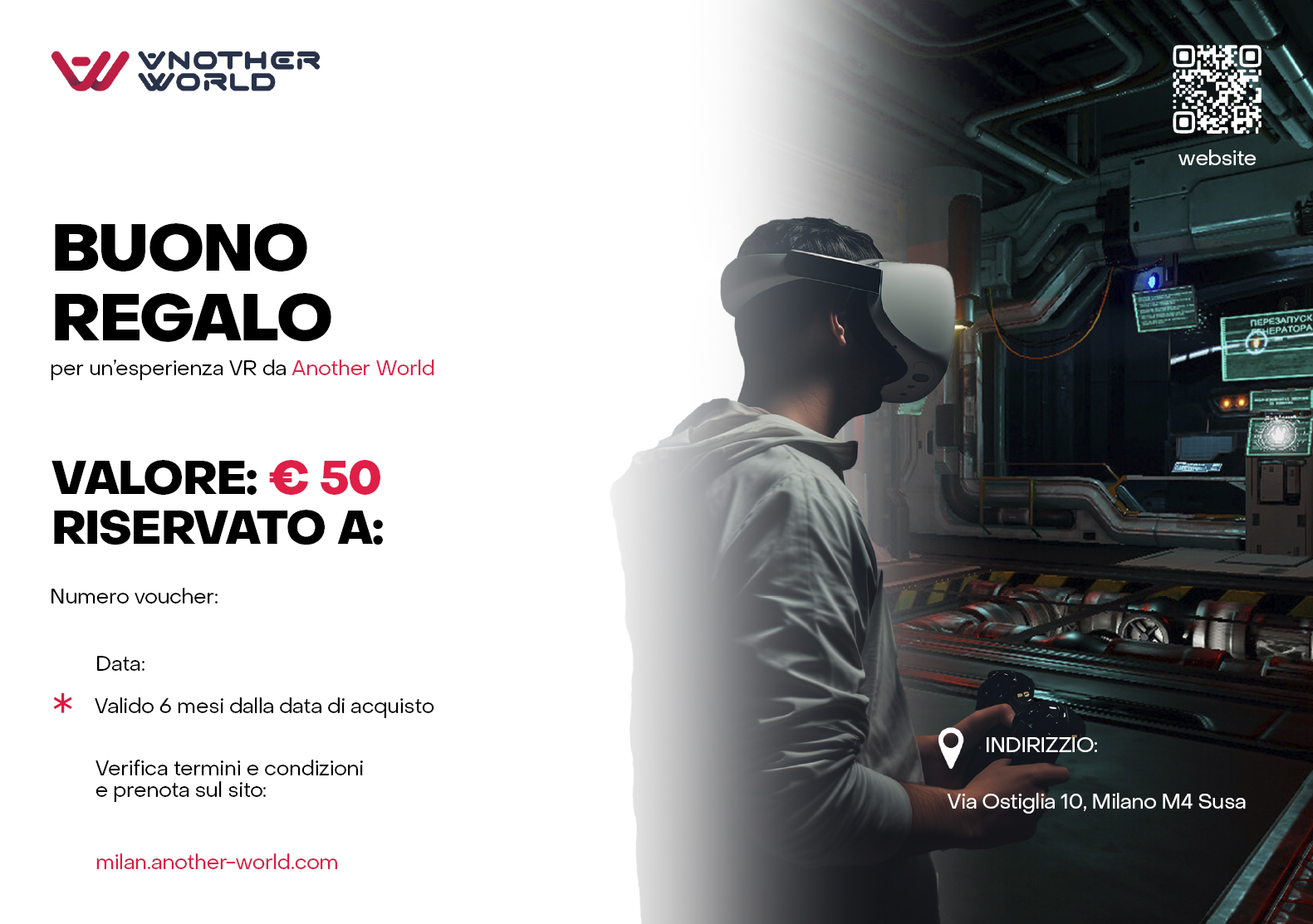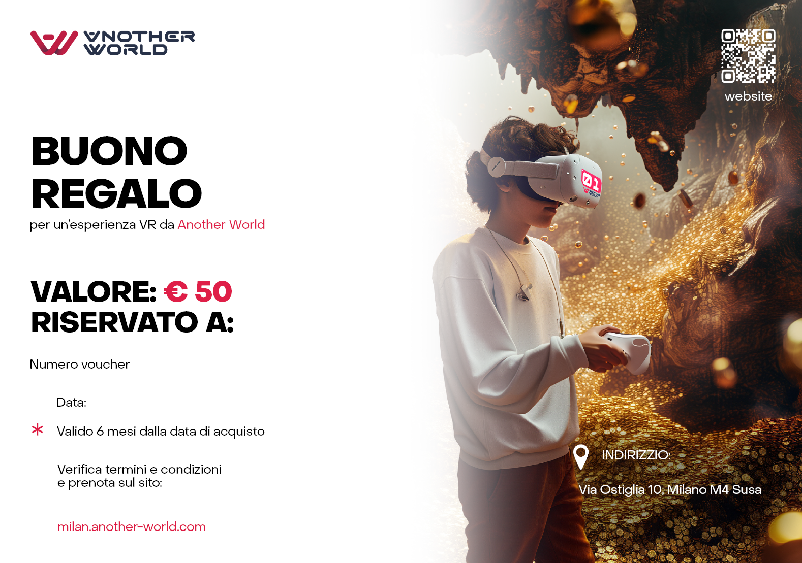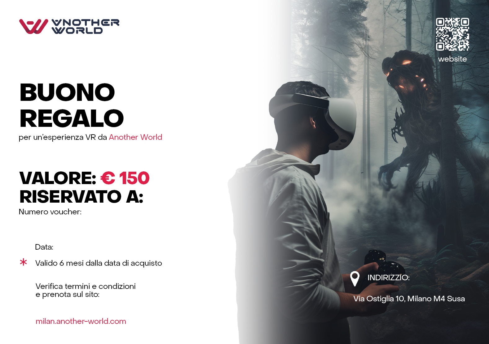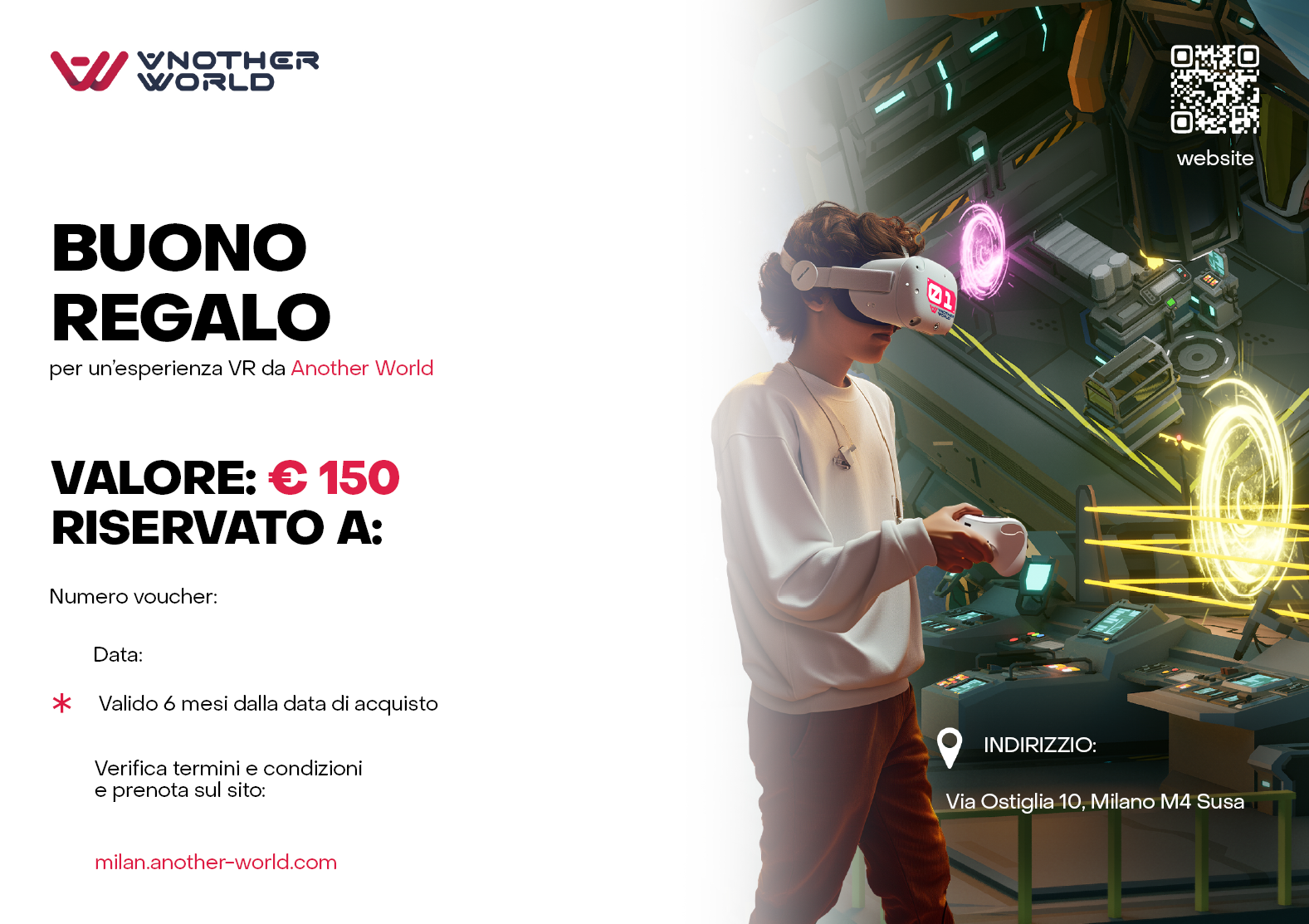 Il buono elettronico è valido sia sul nostro sito che in qualsiasi arena VR della rete Another World. Per usarlo, inserisci il numero del buono nel campo Codice promozionale. Il buono verrà inviato all’indirizzo email indicato al momento dell’acquisto.